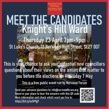 knight's hill ward: meet the candidatesThursday, April 23, 2026Local elections are coming up on Thursday 7 May. Norwood Forum is hosting a series of 'Meet the Candidate' free public events so the community can speak directly to the candidates. |