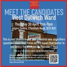 West Dulwich Ward: Meet the CandidatesThursday, April 30, 2026Local elections are coming up on Thursday 7 May. Norwood Forum is hosting a series of 'Meet the Candidate' free public events so the community can speak directly to the candidates. |