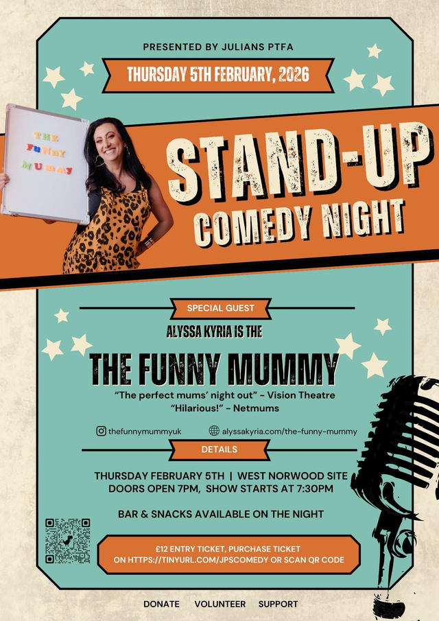 Their evening events like wreath making and quiz night are often sell-outs, and this is also selling fast - so any ex Julian’s parents or other local parents who’d enjoy a bit of relatable humour (play dates, class WhatsApps, school run…) - come along!