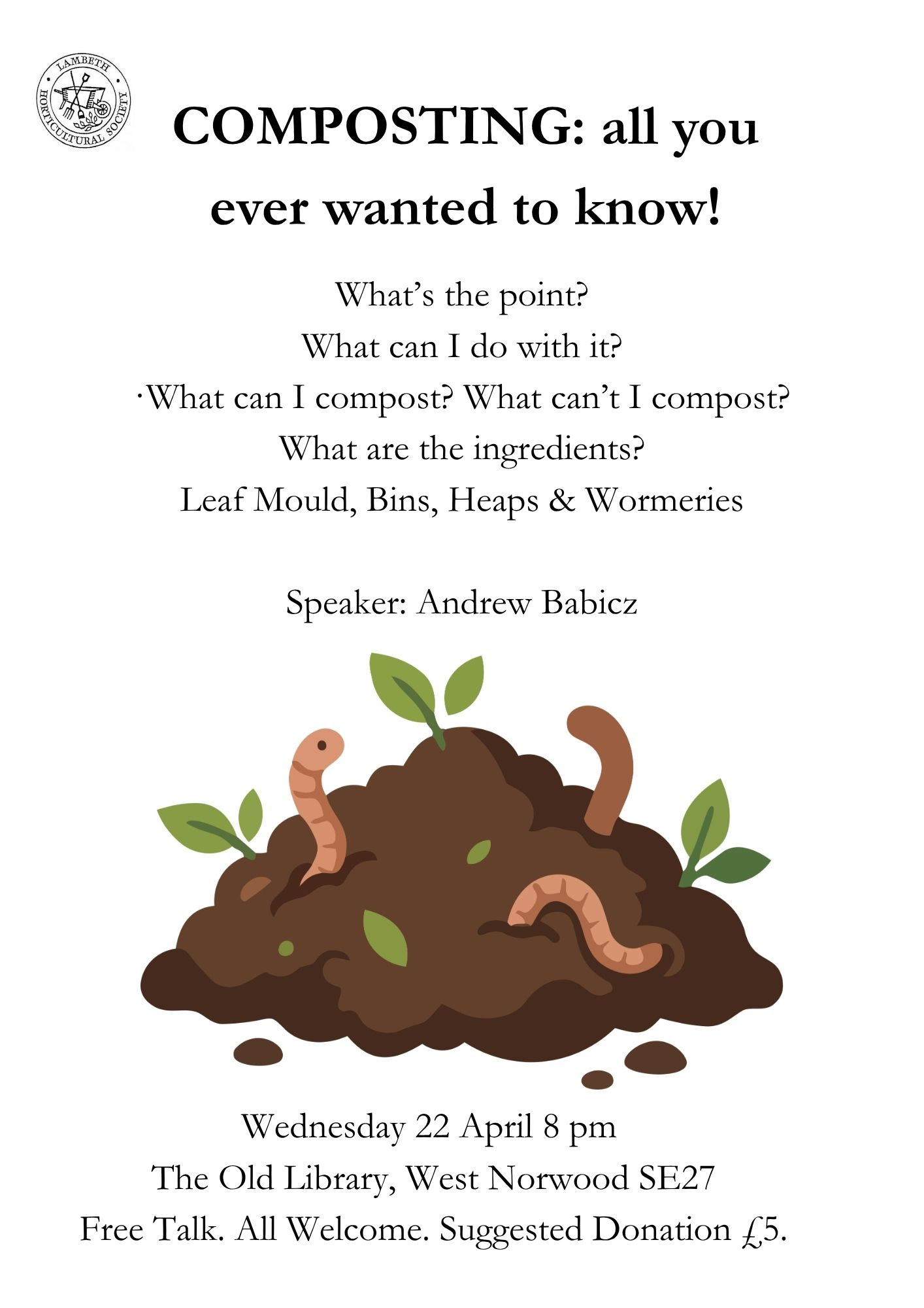 All are invited to this Lambeth Horticultural Society meeting and talk providing a comprehensive guide to composting with speaker Andrew Babicz. Everyone is welcome.