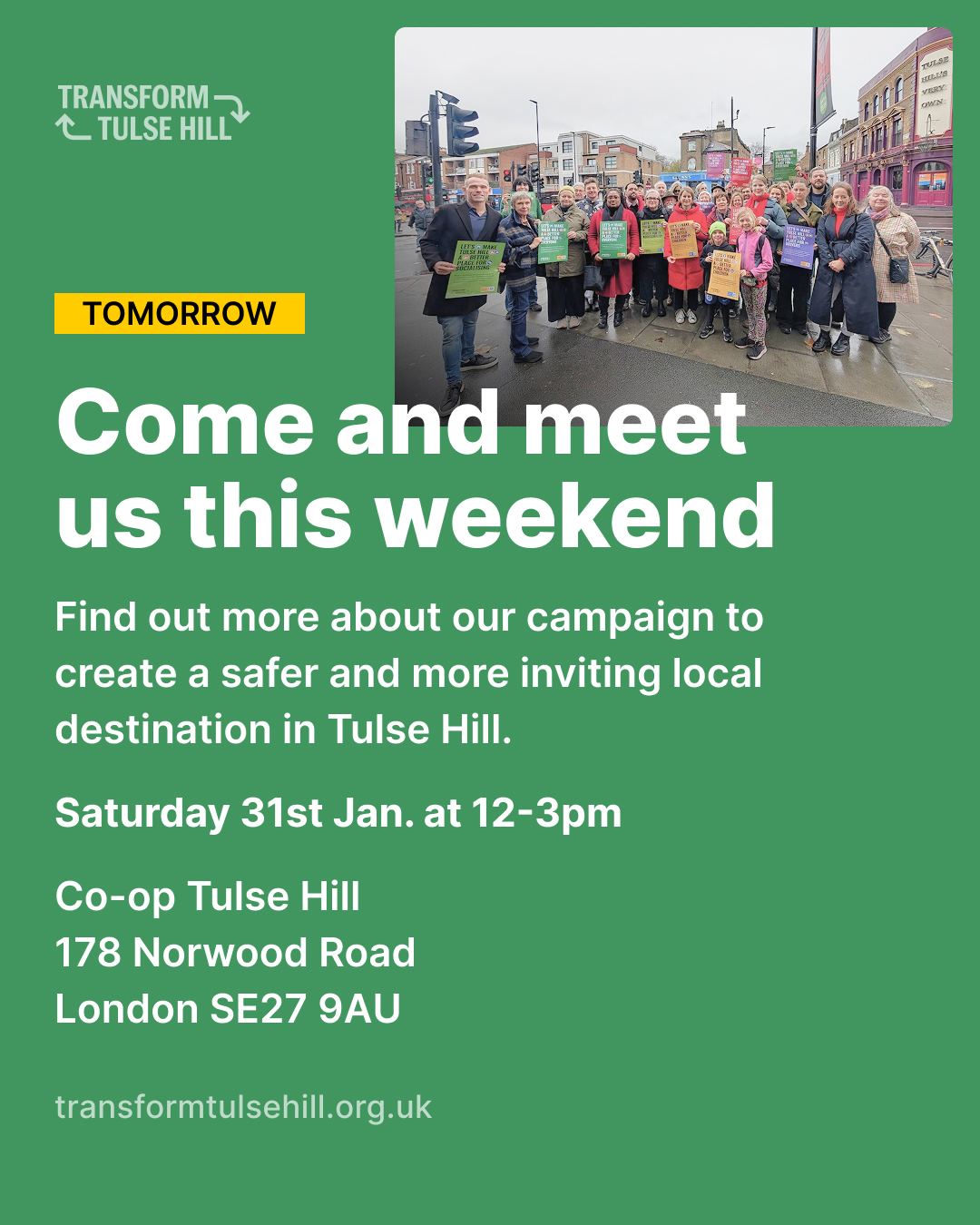 Please drop by the Transform Tulse Hill stall to find out more about our campaign to make Tulse Hill safer and more inviting, and sign our petition to the Mayor of London.