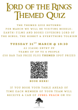 Lord of the rings themed quizTuesday, March 31, 2026The themed quiz returns with a visit to Middle Earth! Films and books covering Lord of the Rings, The Hobbit and everything Tolkein. |