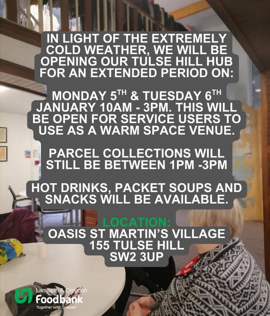 Because of the cold temperatures forecast we will be opening the Tulse Hill Hub as a warm space on Monday 5 January and Tuesday 6 January, from 10am to 3pm.both days.
