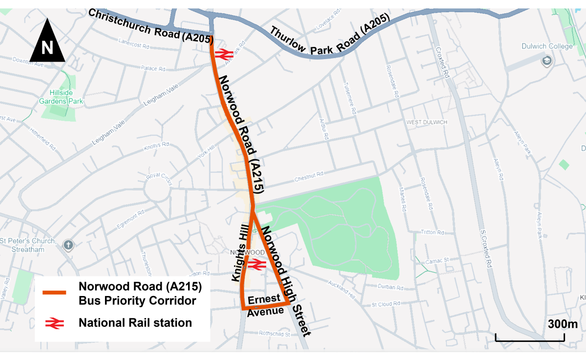 Lambeth Council has announced a project to seek to improve bus journey times along Norwood Road and the A215 Corridor from just south of the Tulse Hill gyratory up to and including the West Norwood gyratory (Norwood High Street/Ernest Avenue/Knights' Hill) to make services faster and more reliable. This work will be funded through Transport for London’s Bus Priority programme.