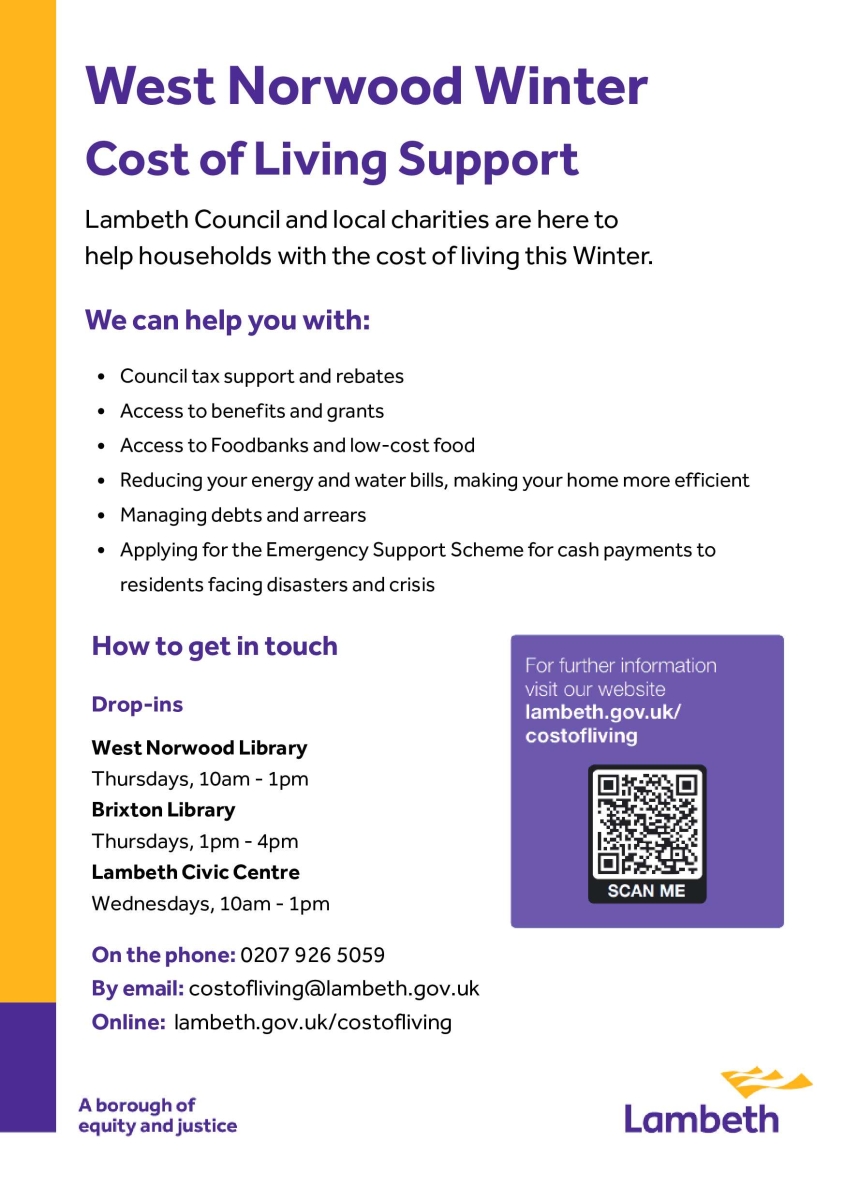 Lambeth Council and local charities are running drop in sessions to help households with the cost of living this winter.