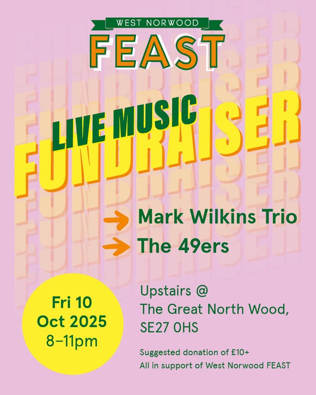 Support West Norwood FEAST at their live music fundraiser held at The Great North Wood on Friday 10 October from 8 to 11 pm. The evening will feature live music by Mark Wilkins Trio and The 49ers. A suggested donation of £10 is requested.