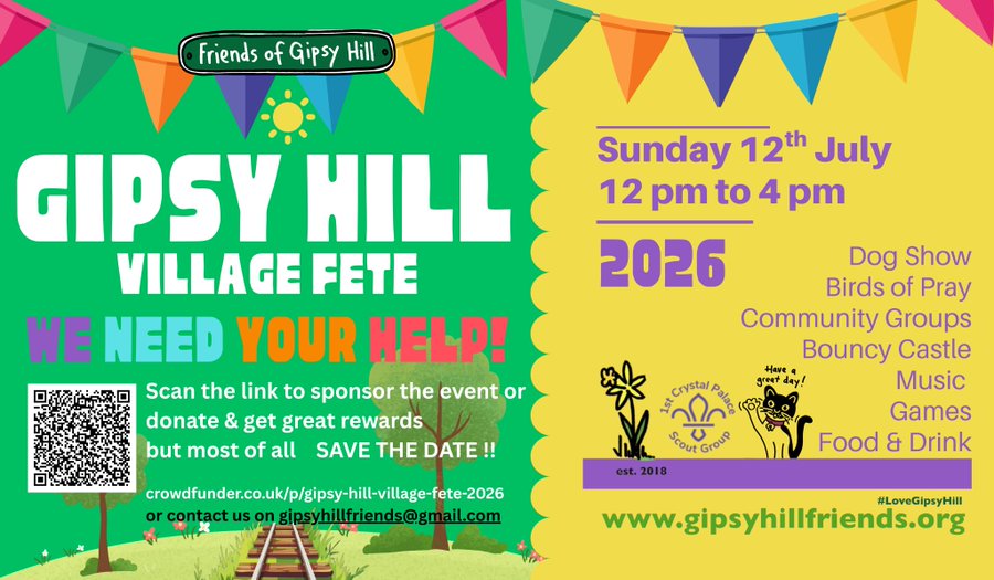 Calling all Gipsy Hillians, would you like to be one of the sponsors for the event or donate to help us being the fete to Gipsy Hill on the 12th July. Birds of Prey, games, music, food and drink, a dog show & community groups but most importantly you: Crowdfunder.