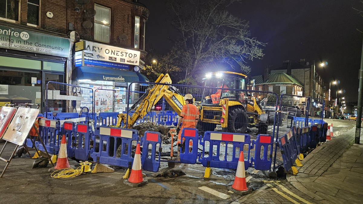 Since early today Friday 28 November 2025, Knight's Hill (northerly direction) has been closed to through traffic from Crown Point to enable Thames Water to mend the burst water main outside West Norwood railway station and The Great North Wood pub.